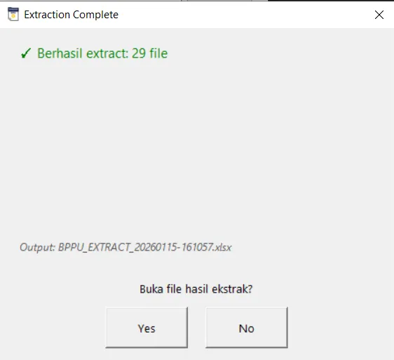 Output : BPPU_EXTRACT_XXXXXXX-XXXXXX.xlsx adalah Nama File Output yang sudah di proses