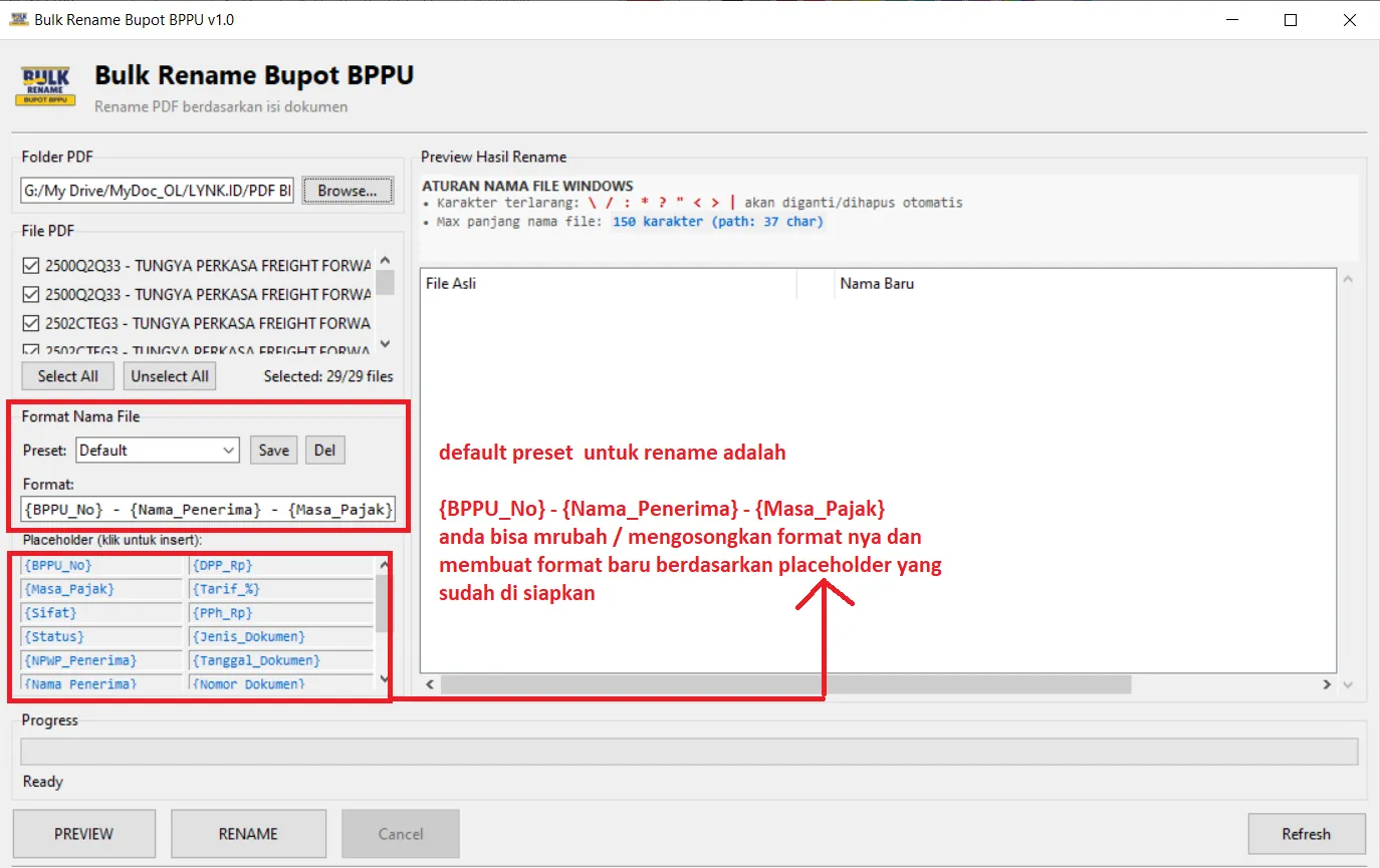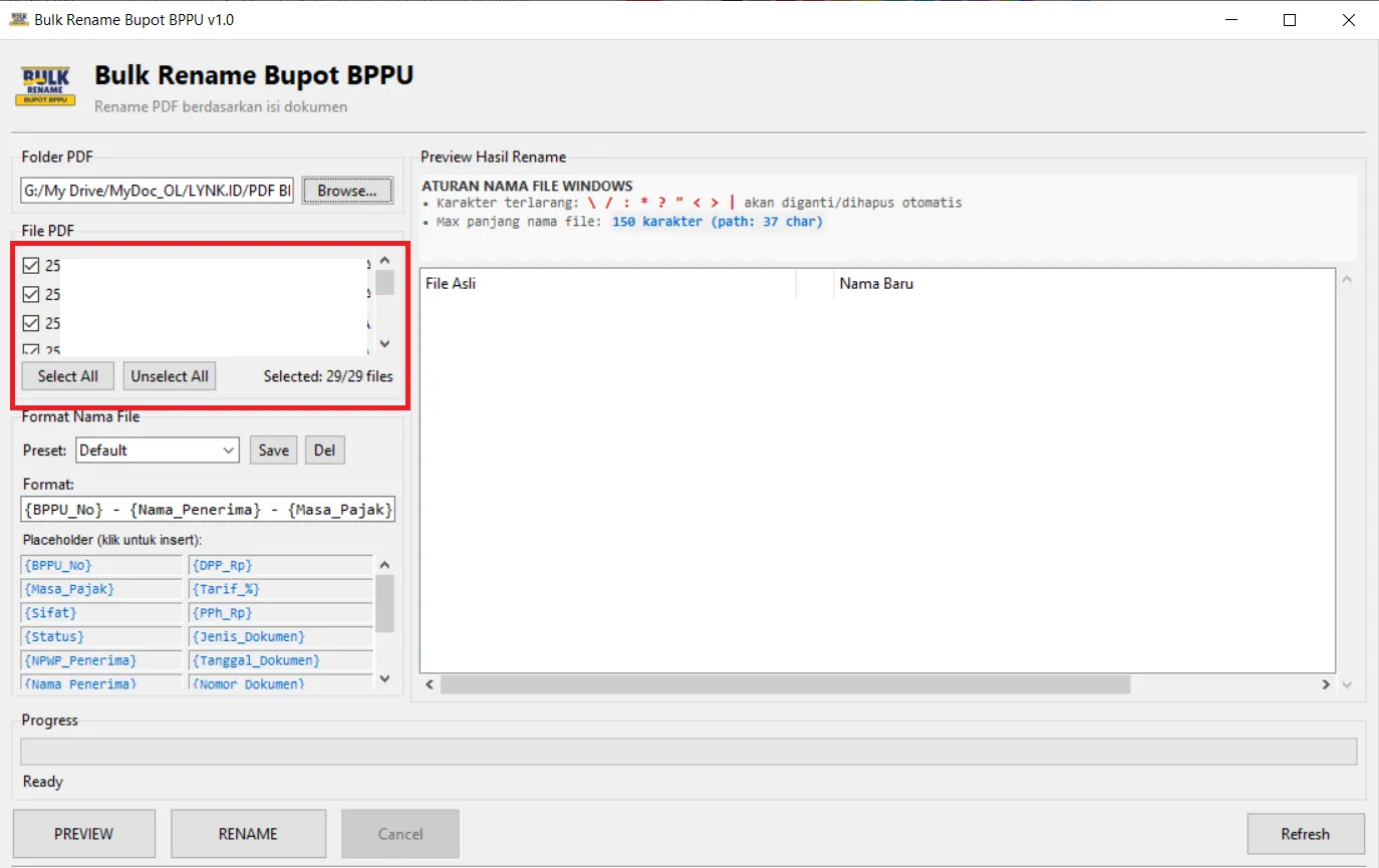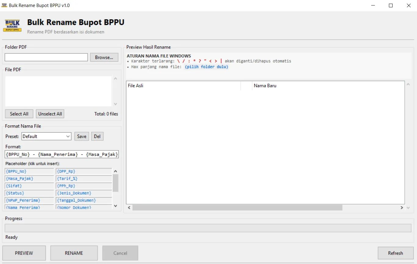 Aplikasi Bulk-Rename BPPU by rakapujo adalah tools desktop yang dirancang untuk Merubah Nama dari file PDF Bukti Potong PPH23 (BPPU) secara otomatis, cepat, dan akurat.