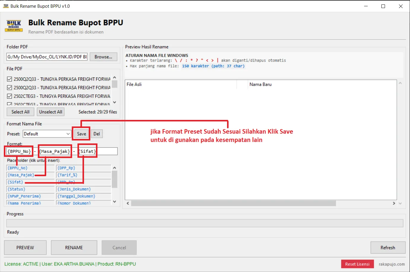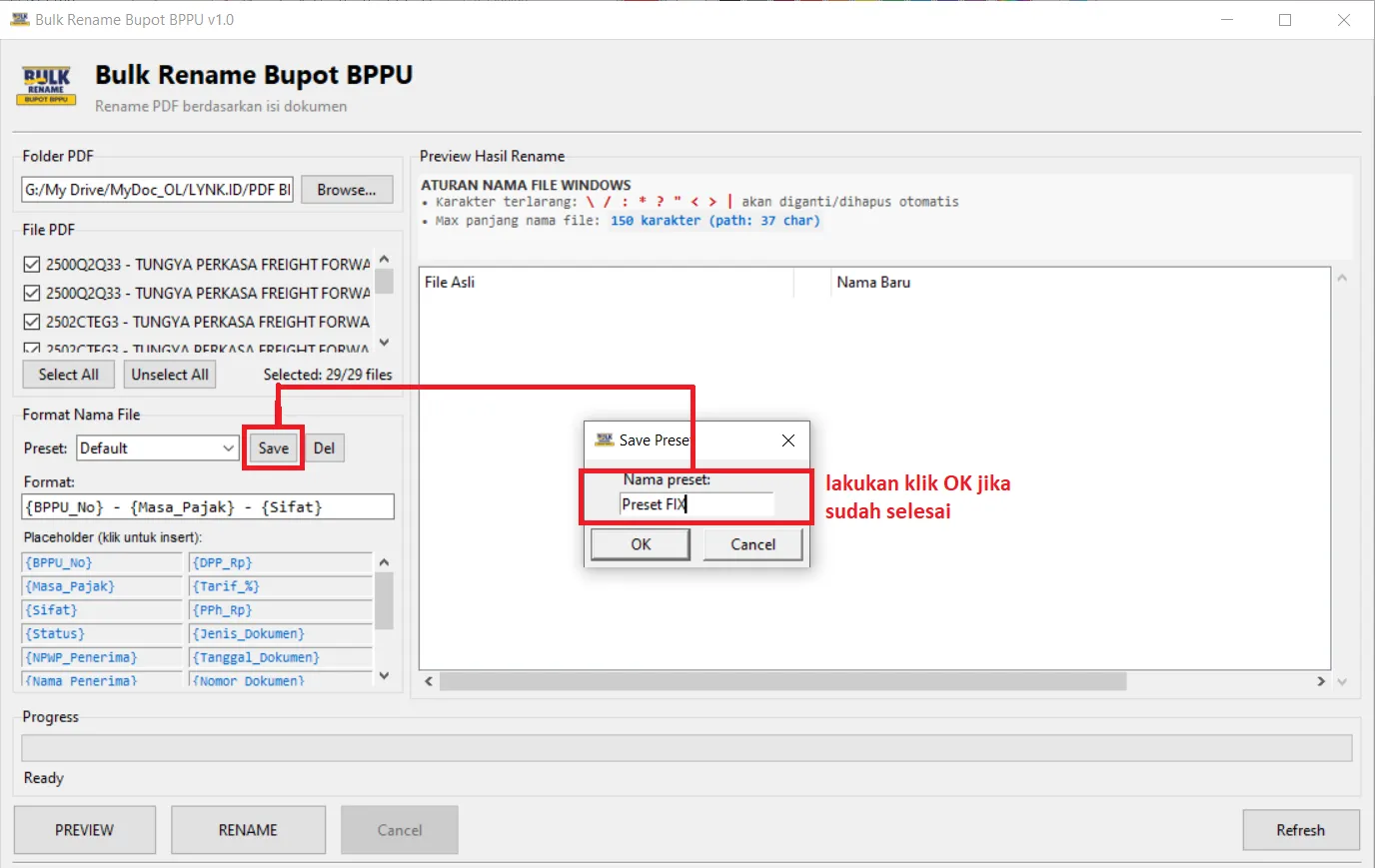 Lalu masukkan format yang anda inginkan dengan mengklik sekali pada list place holder (tambahkan strip dan spasi jika di perlukan) contoh saya akan membuat Preset dengan format {BPPU_No} - {Masa_Pajak} - {Sifat} Jika format preset sudah sesuai lakukan klik save agar bisa di pakai di masadepan dan berikan nama Bebas sesuai kebutuhan seperti gambar di bawah