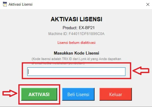 lalu akan muncul window baru, pada window baru anda akan di minta untuk memasukkan Kode lisensi. Kode lisensi adalah Kode Transaksi Dari LYNK.ID yang sudah anda simpan sebelum nya, isikan di form "Masukkan Kode Lisensi" lalu klik validate. jika Sudah Berhasil nanti akan muncul notifikasi "Lisensi Berhasil di Aktivasi"