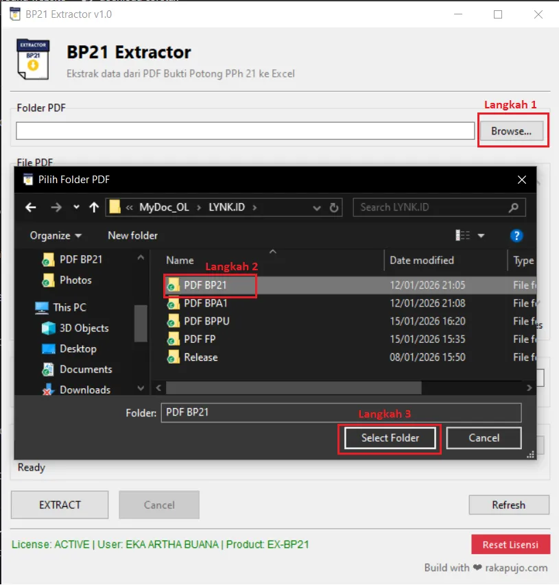Aplikasi Ekstraktor BP21 by rakapujo adalah tools desktop yang dirancang untuk mengekstrak data dari file Bukti Potong PPH21 (BP21) berbentuk PDF langsung ke Excel (.xlsx) secara otomatis, cepat, dan akurat.