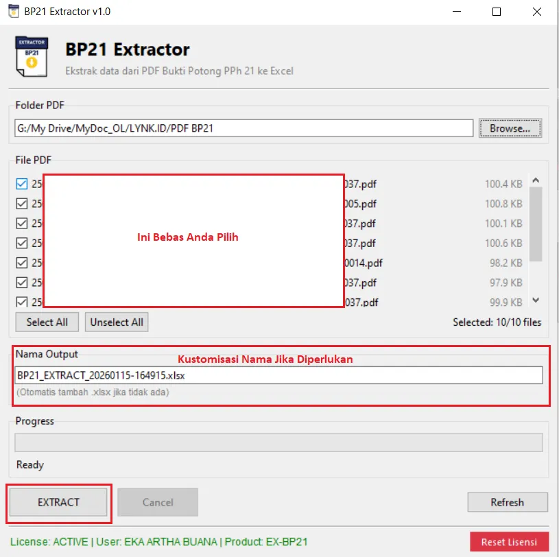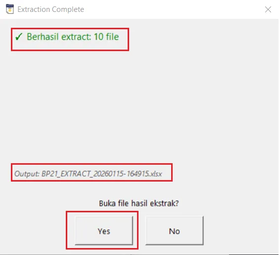 Output : BP21_EXTRACT_XXXXXXX-XXXXXX.xlsx adalah Nama File Output yang sudah di proses