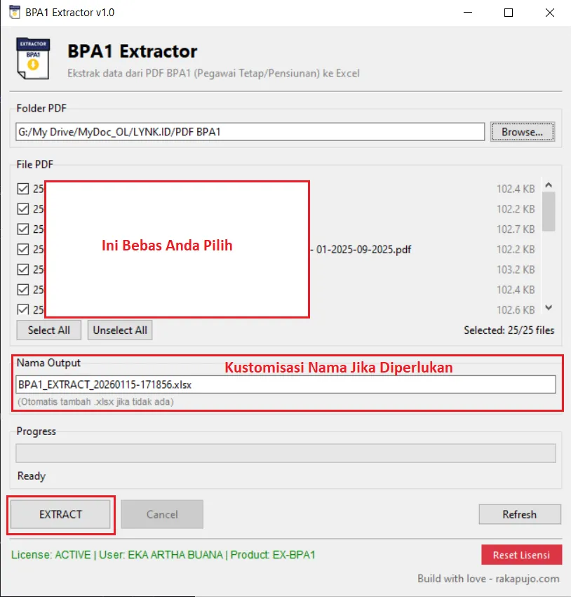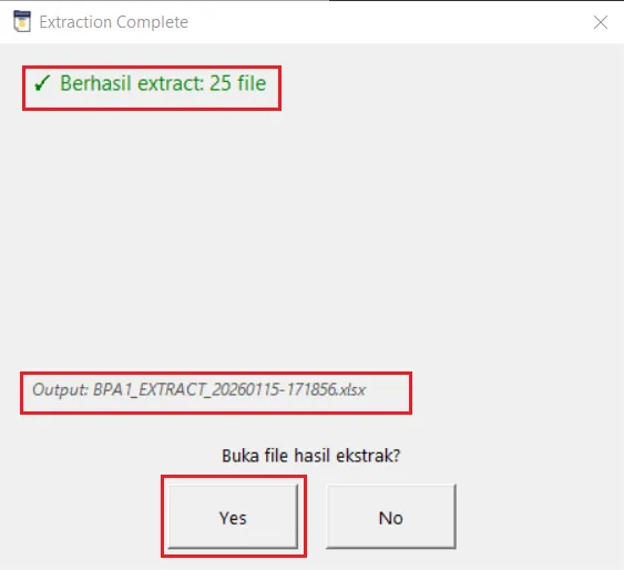 Output : BPA1_EXTRACT_XXXXXXX-XXXXXX.xlsx adalah Nama File Output yang sudah di proses